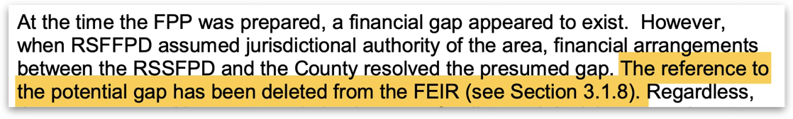 ‍The County ultimately gave RSF Fire a one-time payment of $2.5 million which was supposed to be amortized over 8 years but doesn’t come nearly close to resolving the 7 figure yearly shortfall. Interestingly, it expires in 2025, just in time for HGVS to be approved. This was far from sufficient to resolve the shortfall. When HGV South came along, the environmental documents made extensive reference to “helping solve the shortfall.” After the community provided a comment on this, the County revised the documents to note that “financial arrangements” resolved the gap. What exactly were those arrangements?